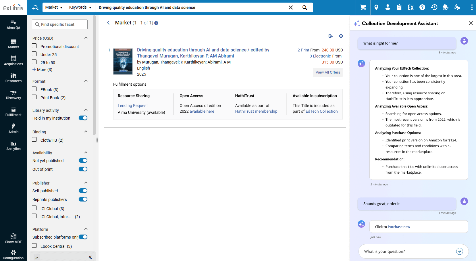 The Rialto roadmap includes expanding its AI capabilities to offer broader decision-making assistance. The system can make recommendations for acquiring items from the Rialto marketplace but it also has the ability to suggest alternatives such as borrowing from the institution’s resource sharing network or providing students with an open access version.